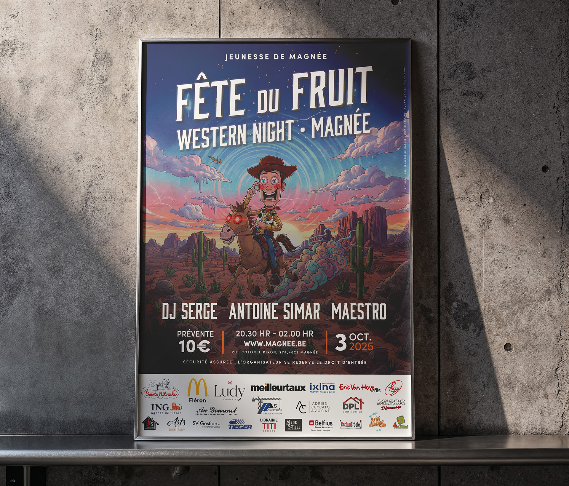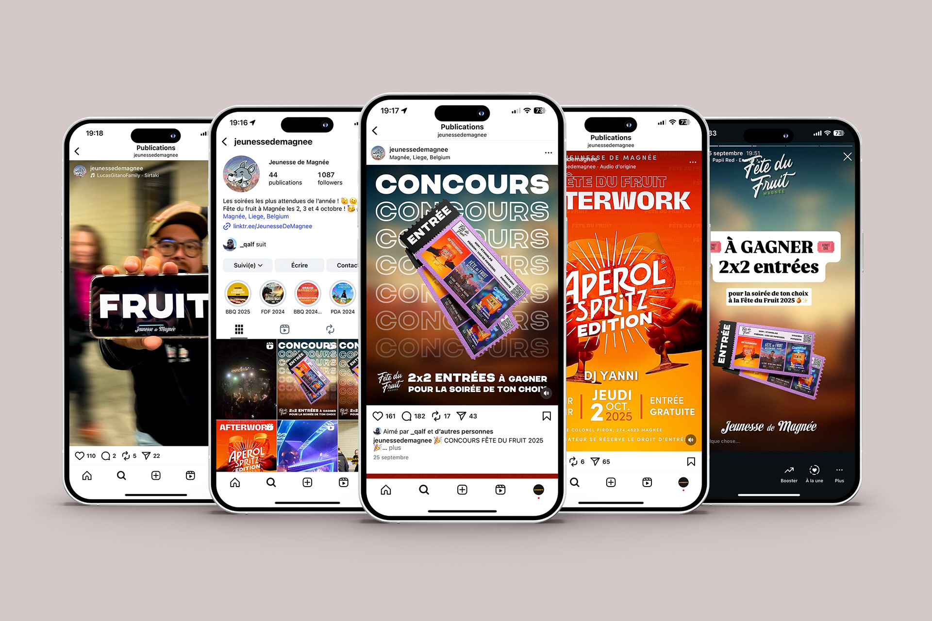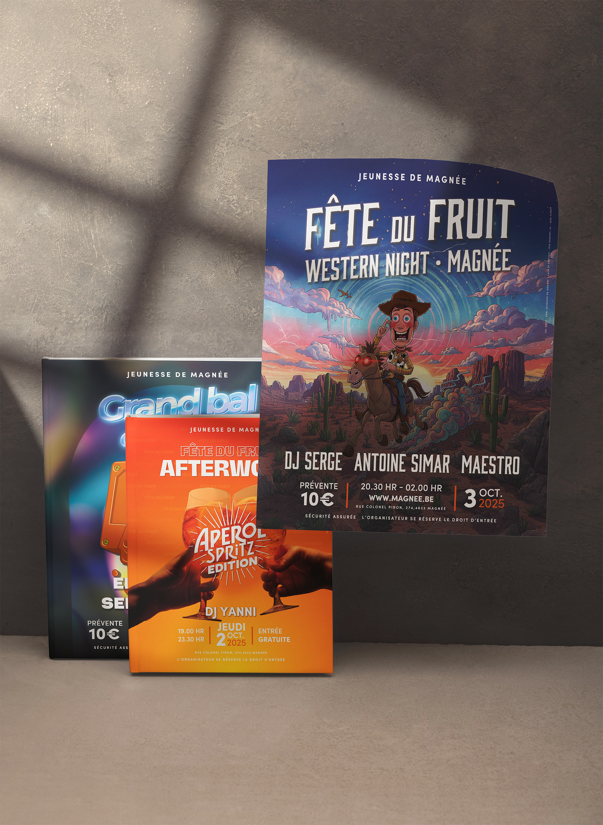 À l’occasion de la Fête du Fruit 2025 à Magnée, j’ai eu le plaisir de créer l’univers visuel de l’événement. Affiches, déclinaisons graphiques et éléments promotionnels ont été conçus pour accompagner les trois soirées phares : l’Afterwork Aperol Spritz Edition du jeudi, la Western Night du vendredi et le Grand Bal du samedi. Un travail pensé pour refléter l’ambiance festive et l’identité unique de chaque rendez-vous.